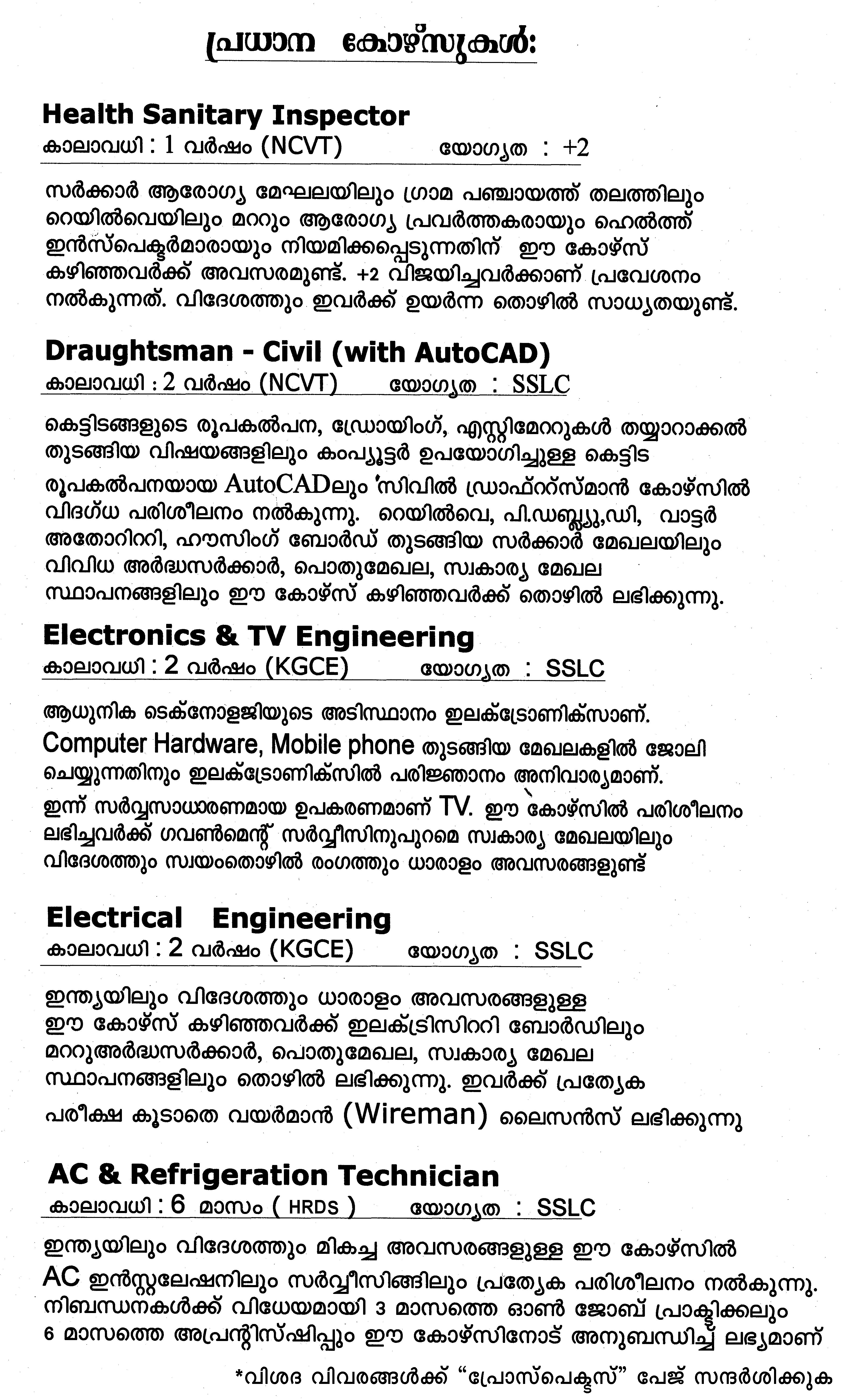Building Construction Supervisor, Architeural AutoCAD 2014, 3D Visualisation, 3D Drafting with Revit, Basic Electrical, House Wiring, Basic Electronics, Television Servicing, Computer Applications, TALLY 9.0, Beautician.